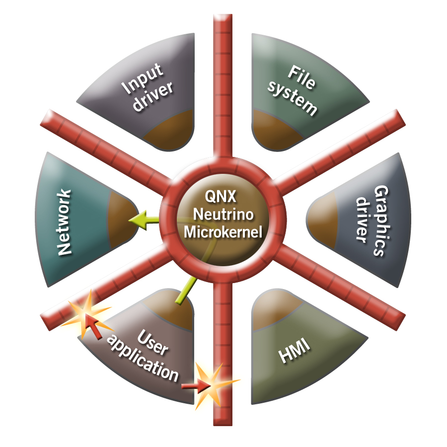 In addition to the field-proven reliabilty of the standard QNX Neutrino RTOS, the QNX Neutrino RTOS Secure Kernel provides different privilege levels for different applications, mediation to verify all accesses, and a mechanism for resource protection.